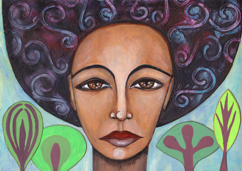His skin is a matt brown colour which was a lot easier to paint than shiny dark skin and I made the texture in his hair using paper cuts collaged using gesso, then a layer of black paint. I lightly dabbed the paper cuts with white acrylic to add highlights, then added translucent glimmer mist and dylusions spray inks to give colour and a bit of shine.