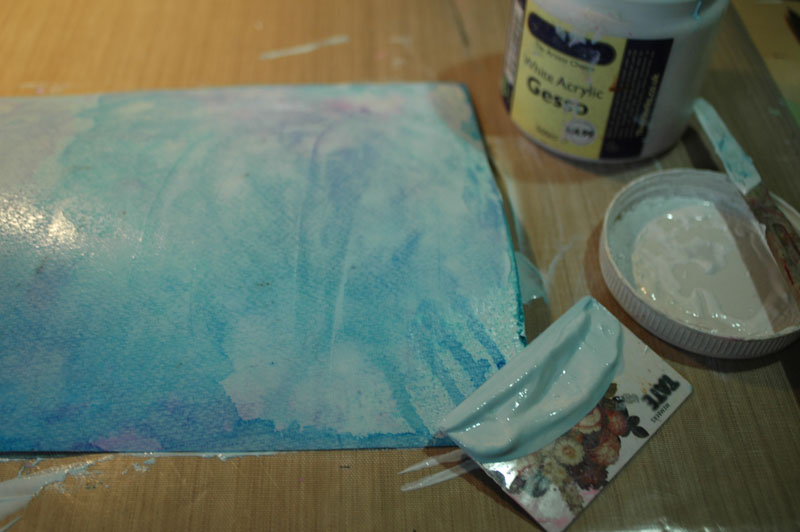 Then using acrylic gesso, spread it onto the paper using an old store card, this gives a very thin and even coverage of gesso. Gesso both sides with 2 layers leaving the paper to throroughly dry between layers.