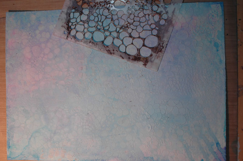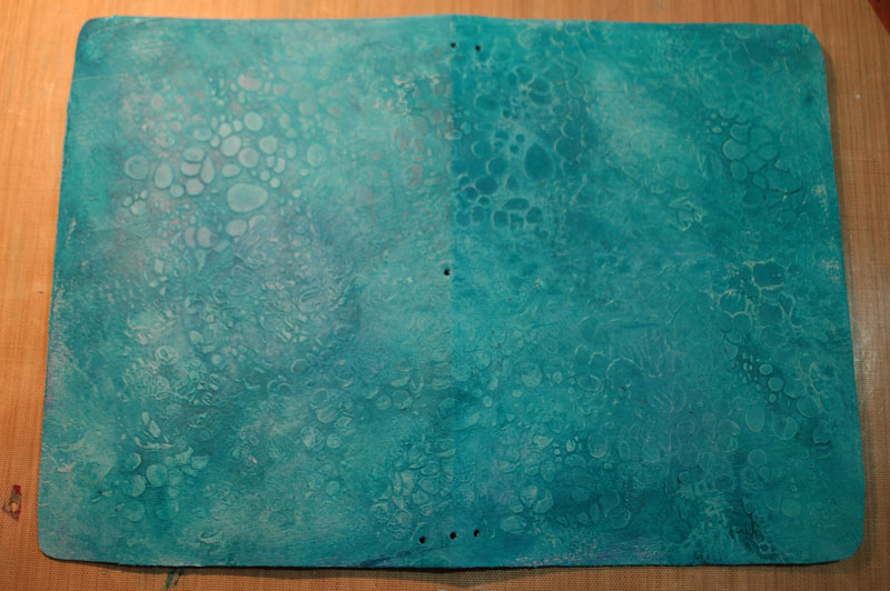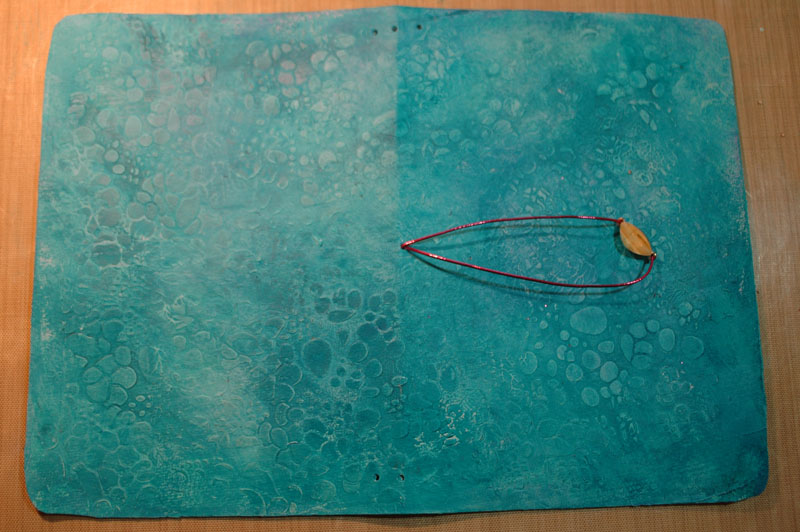 I made one last layer of gesso, scraping it through a stencil to give an organic leather grain effect.
