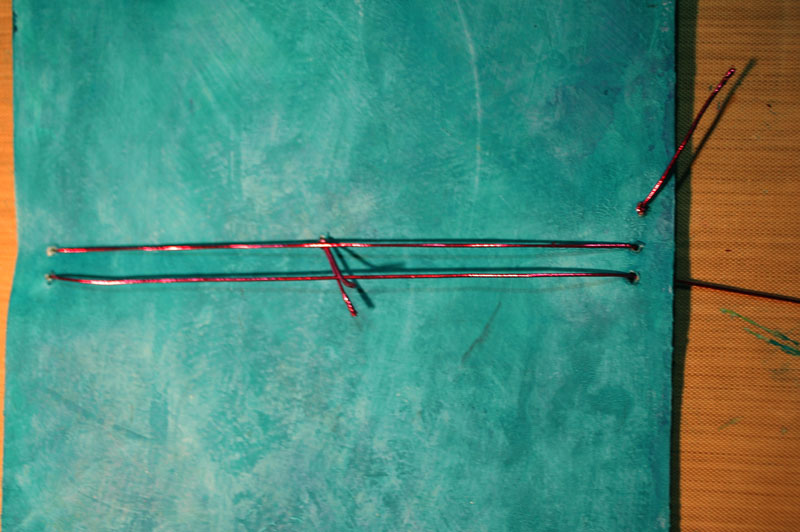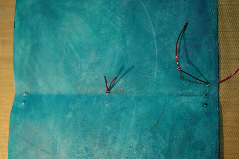 I then made holes for the elastic notebook holders. I decided to make my own version of the threading making a hole in the center of the cover for the elastic tie, then more holes at the top and bottom as shown below. Mine are about a cm apart and a cm in from the edge of the cover. You will need to make 3 holes at the bottom and 2 at the top. (mine were a bit wonky..) If you make the holes from the outside in, it looks a bit neater, you can dab a little ink on the holes if the white paper shows through the puncture. I also rounded the edges of my cover.