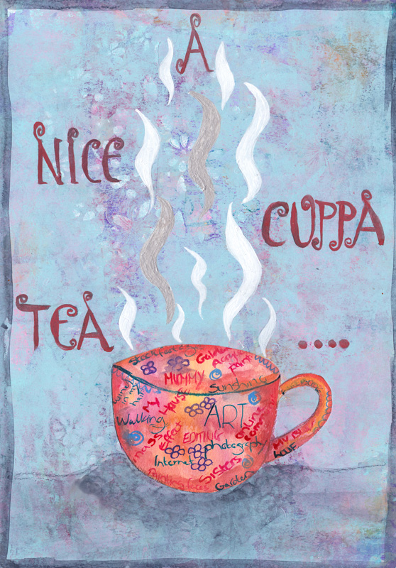 I’ve also managed to finish a few Life book lessons which I combined into one painting, the lessons involved using text, metallic paint and a vessel to hold our favorite things.. and right now a nice cup of tea is just what I want.