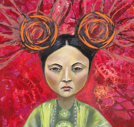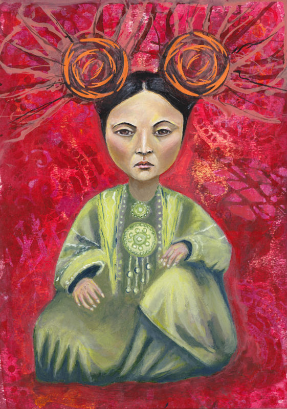 I’ve finally finished my Mongolian warrior queen painting, it was inspired by an archival image of a queen in full regalia and I imagined that she would get her powers from swirling antler-like balls in her hair. :) I think I have been playing too many video games..