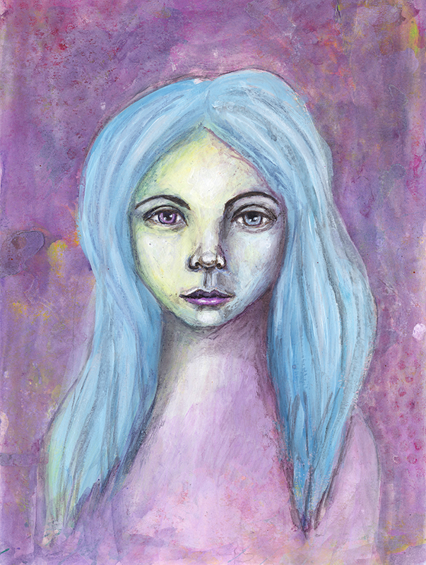 I tried a new technique with this painting, our teacher asked us to use water soluble crayons (I love these!!), charcoal and white paint to create a rather soulful image.