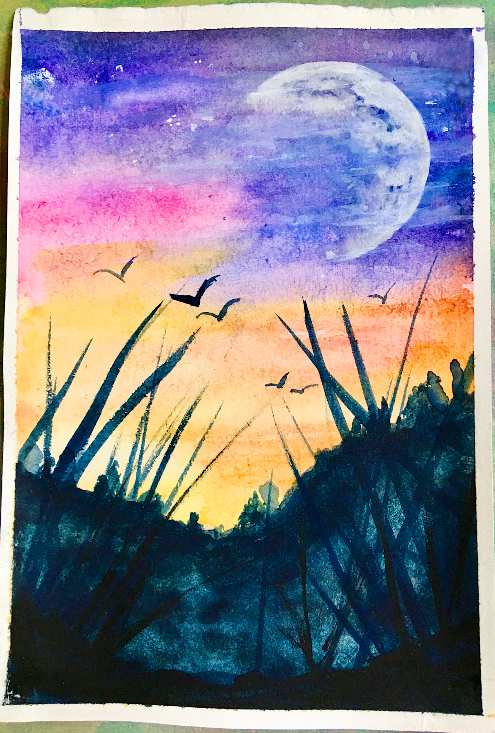 I loved using the colourful paints to depict the skies, the beautiful moon peeping through the clouds and the lovely silhouetted grass in the foreground.