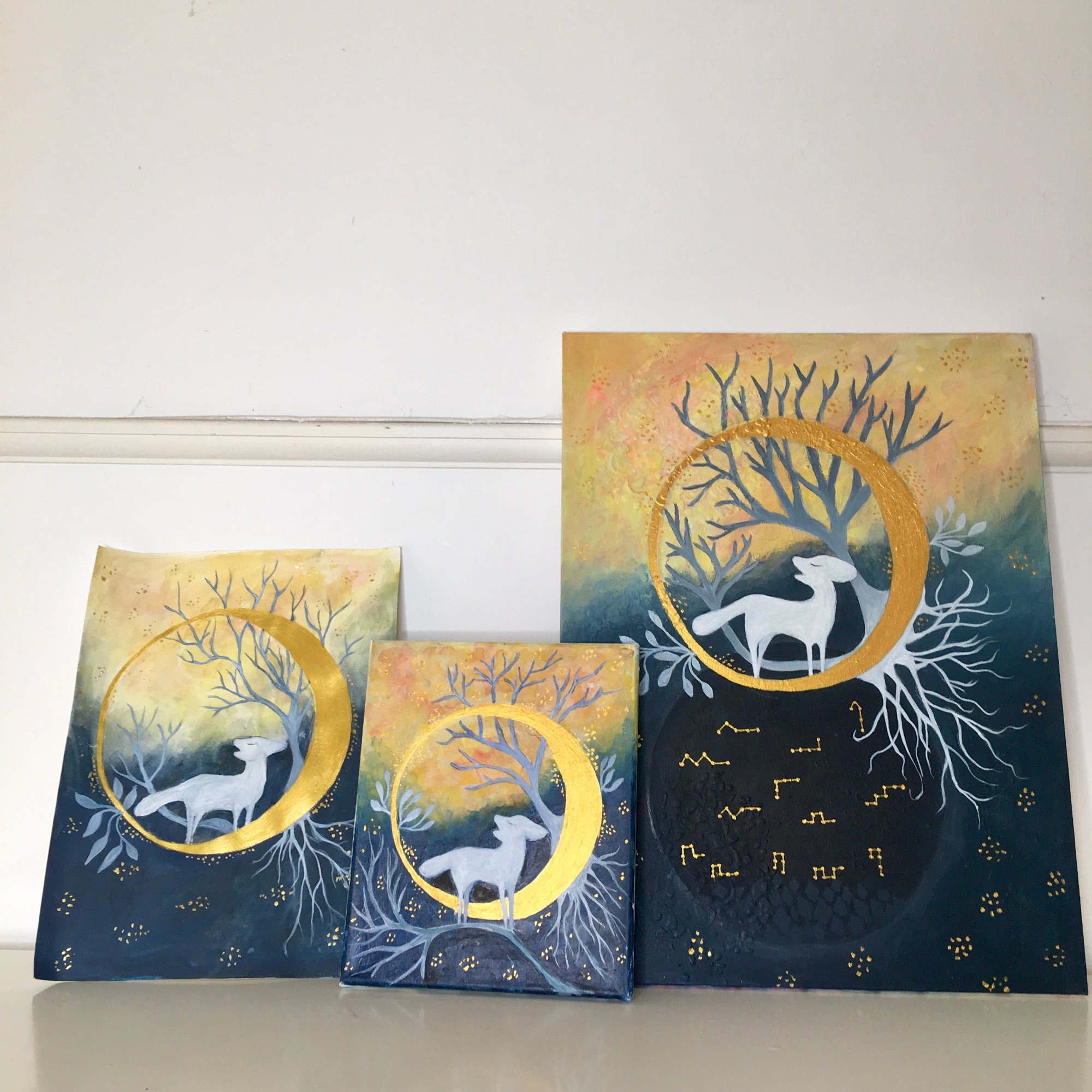 I wanted to tell you about how I loved my wolf moon painting so much that I decided to paint it 3 times! Once on paper, then on a small canvas and then a big canvas, the big one is now up on my wall!